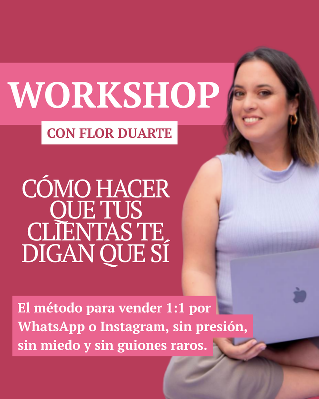 Después de este workshop vas a tener un proceso de venta claro, natural y repetible,para generar más “sí”, más ingresos y más confianza en cada conversación — ya sea por WhatsApp o mensajes de Instagram.